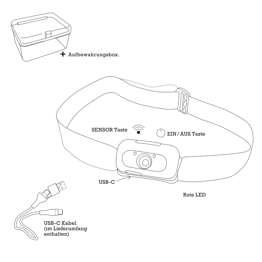 HEAD+BEAM100, black as night, 100 Lumen, Stirnlampe mit Box und USB-A/C-C Ladekabel