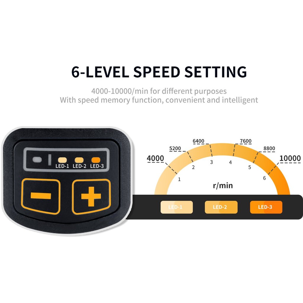 Akkuschleifer mit 3 mm Schleifhub für 32 mm Schleifblüten. Kit enthält Maschine mit Akku und Ladegerät sowie je 1 Pack Schleifblüten Micrum P2000 + P3000.