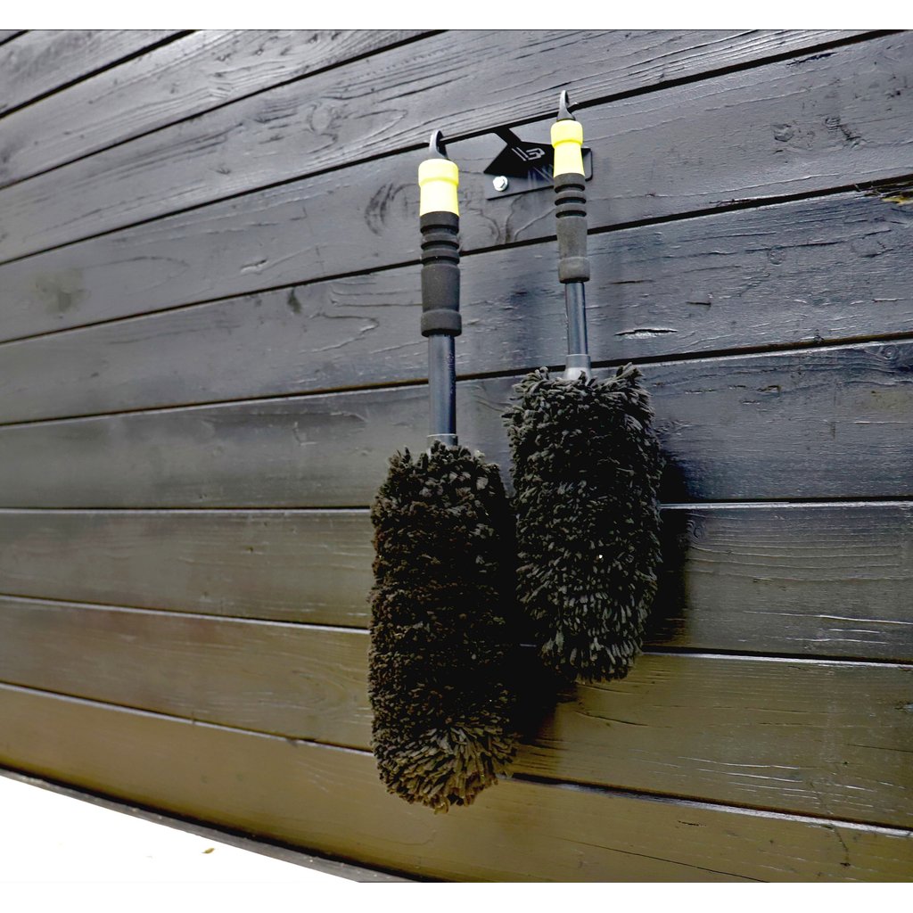 Manche ergonomique de haute qualité pour deux brosses. Développé pour une utilisation efficace de l'espace de travail. Le support est en acier de 1,5 mm et pèse jusqu'à 0,5 kg. Les crochets étroits s'adapteront à la plupart des trous du manche de la brosse. La longueur du crochet est de 6,5 cm, de sorte que même les grandes brosses ne touchent pas le mur.