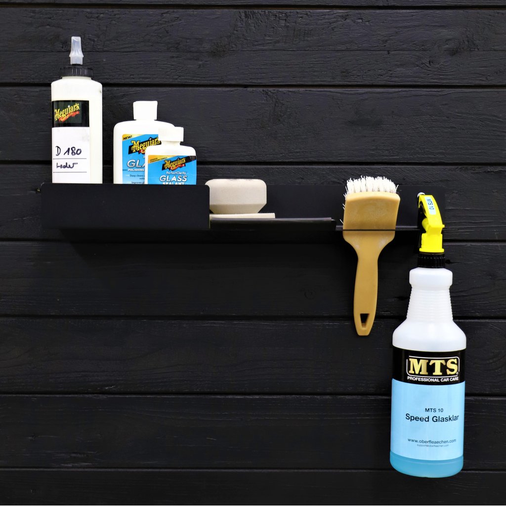 Plateau pour stocker et organiser les produits d'entretien du cuir, un système spécialement développé avec un espace utilisable pour accueillir tous les appareils d'entretien du cuir en un seul endroit. Dans la partie gauche de l'étagère (20 cm), vous pouvez stocker des bouteilles autoportantes, par ex. B. Conditionneur. Vous pouvez ranger jusqu'à 3 brosses dans la partie médiane du plateau (15 cm), tandis que des bouteilles avec un atomiseur peuvent être fixées sur la partie droite du plateau (15 cm).Fabriqué en acier durable de haute qualité. Découpé et plié avec précision, enfin pourvu d'un revêtement en poudre pour fournir une couche de protection supplémentaire contre l'oxydation.