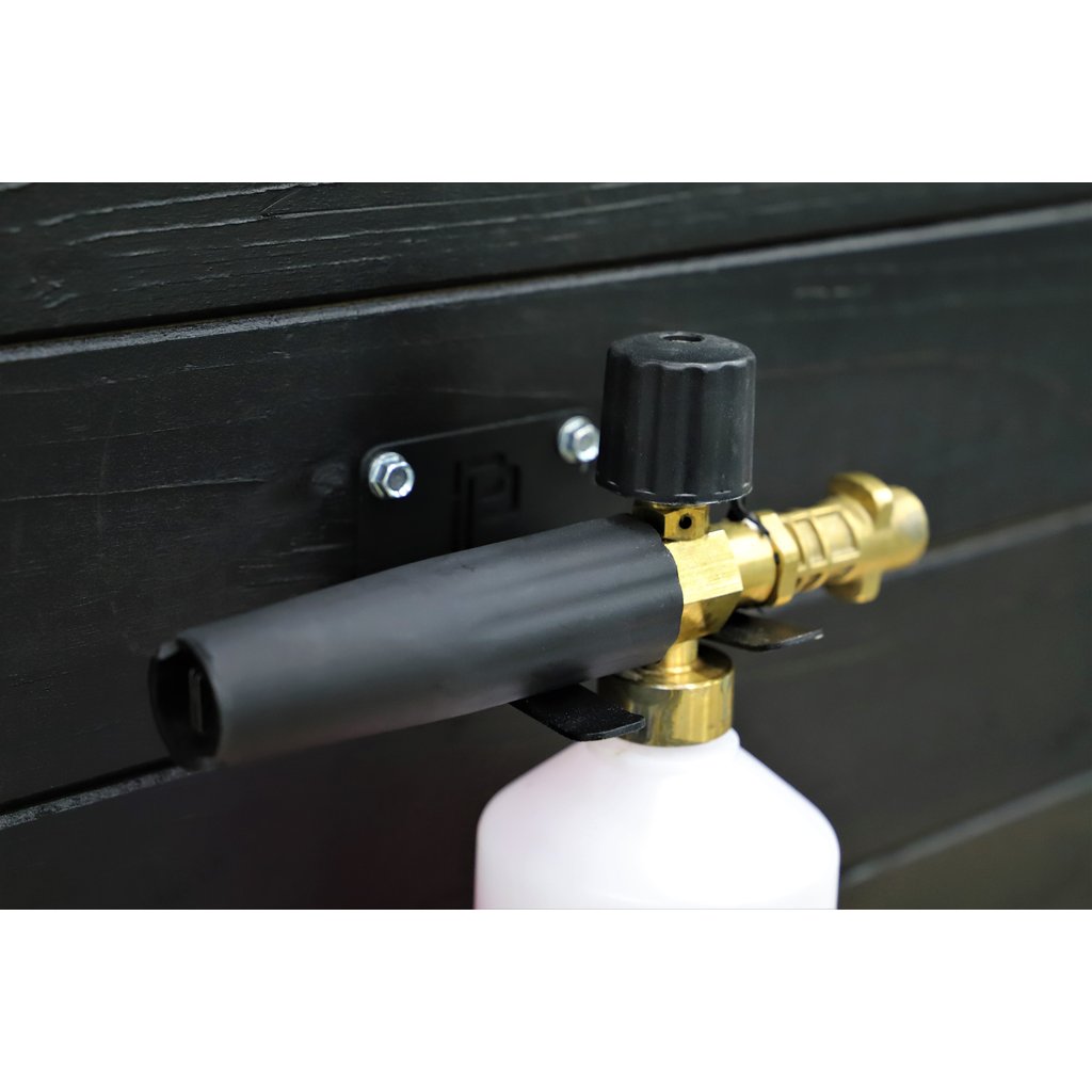 Universelle Halterung für Snow Cannons, Tornadoren, Bürsten, Handsprühgeräte usw. Der Abstand zwischen den Armen (33 mm) wurde so ausgelegt, dass er für alle Arten von Zubehör passt. Zum Beispiel können wir einen Tornado, grössere Bürsten, Schäumer, manuelle Drucksprüher und vieles mehr sicher aufhängen. Hergestellt aus hochwertigem, widerstandsfähigem Stahl, präzise geschnitten und gebogen, schliesslich innen und aussen pulverbeschichtet, um eine zusätzliche Schutzschicht gegen Oxidation zu bieten.
