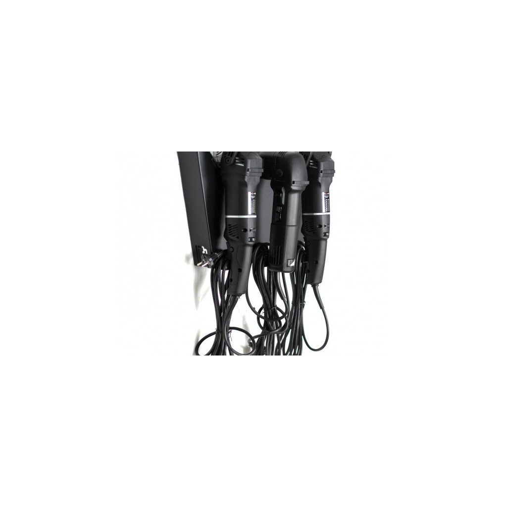 Hochwertige Halterung für 3 Poliermaschinen, mit praktischem Kabelhalter. Für Exzenter- und Rotationsmaschinen mit Stütztellern von 30 bis 180 mm geeignet. Die Kante, auf der die Maschine ruht, ist mit einer Gummidichtung geschützt.
