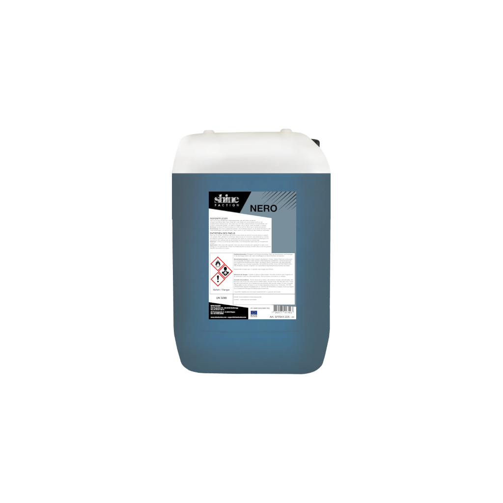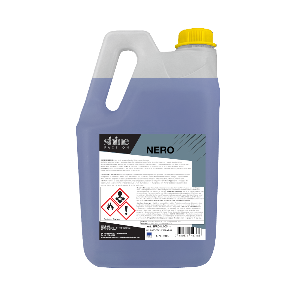 Nero ist ein lang anhaltendes Reifenpflegemittel, das alle Reifen anhaltend schwarz erscheinen lässt. Nero dringt tief in den Reifen ein und ist daher nicht nur ein oberflächliches Glanzprodukt. Nero kann auch auf allen unbeschichteten Kunststoffteilen und Gummi‘s verwendet werden, um diese zu pflegen und in neuem Glanz erstrahlen zu lassen.
